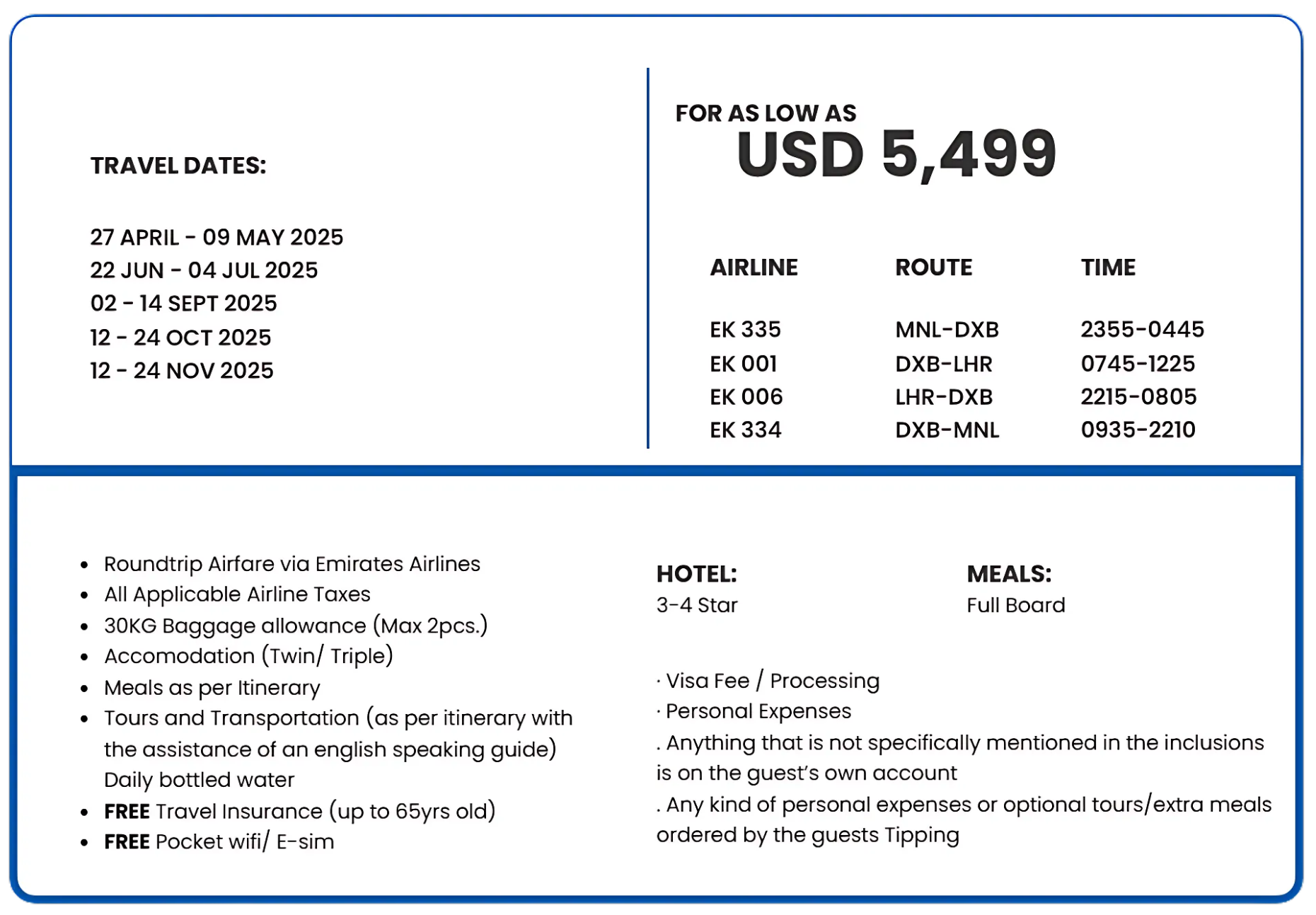 Date | 27 APRIL – 09 MAY 2025, 22 JUN – 04 JUL 2025, 02 – 14 SEPT 2025, 12 – 24 OCT 2025, 12-24 NOV 2025 |